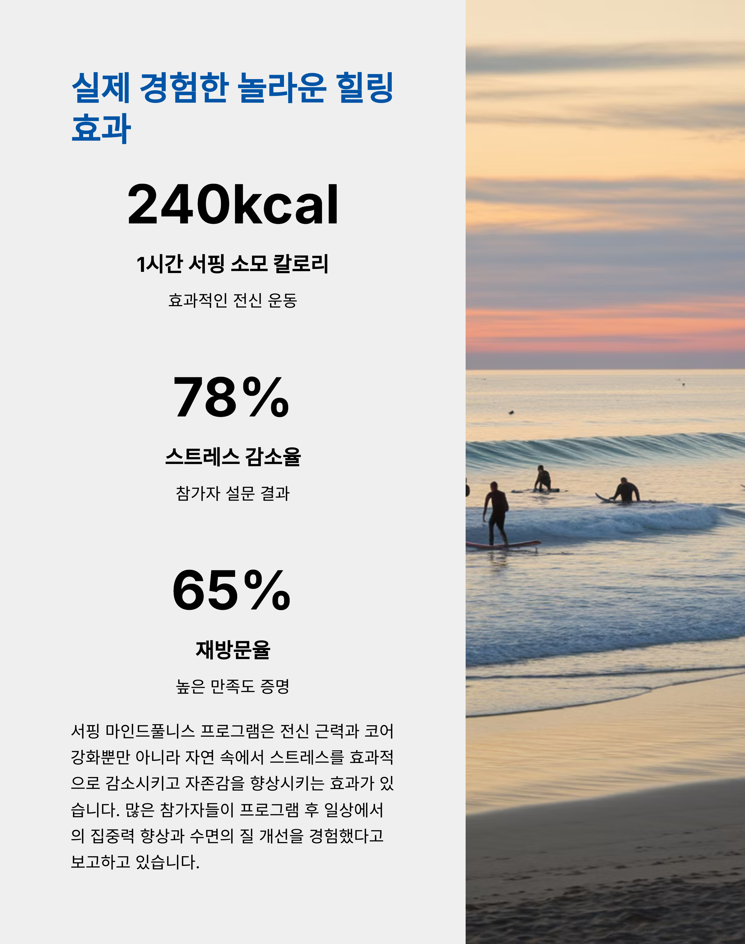 - 심리적 안정: 참가자들은 서핑과 명상을 통해 스트레스 감소와 정서적 안정감을 경험했다고 보고합니다.