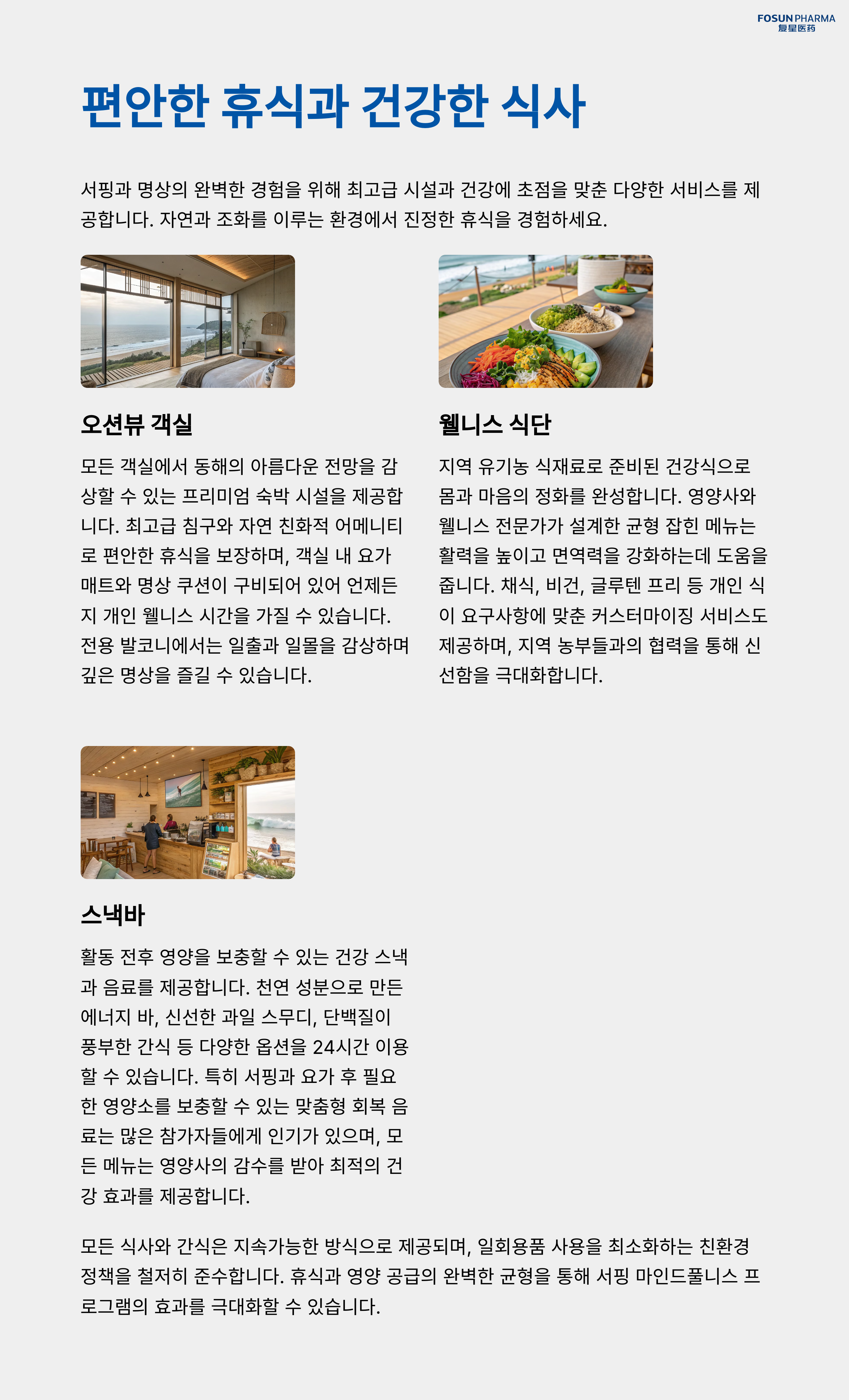 - 식사: 지역 식재료를 활용한 건강식 제공. 채식 옵션도 마련되어 있습니다.