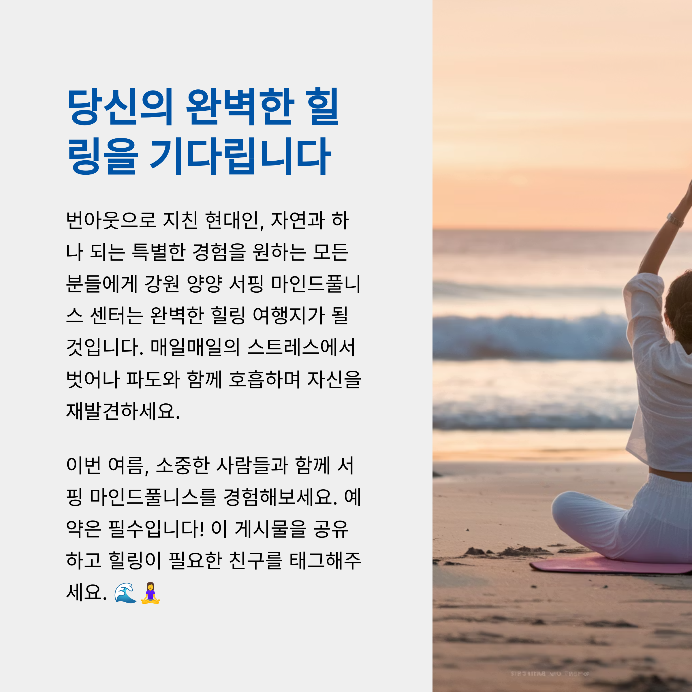 이상으로 강원 양양 '서핑 마인드풀니스 센터'에 대한 상세 정보를 제공해 드렸습니다. 다음 글에서는 다른 힐링 명소에 대한 정보를 준비하겠습니다.