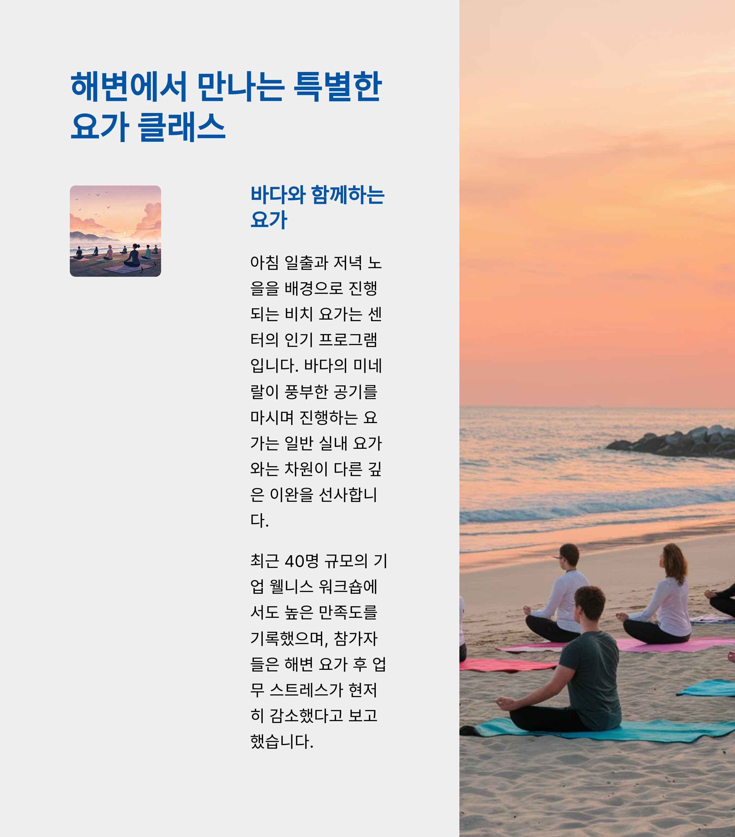 - 내용: 해변에서 진행되는 요가 수업으로, 자연의 소리와 함께 심신의 이완을 도모합니다.