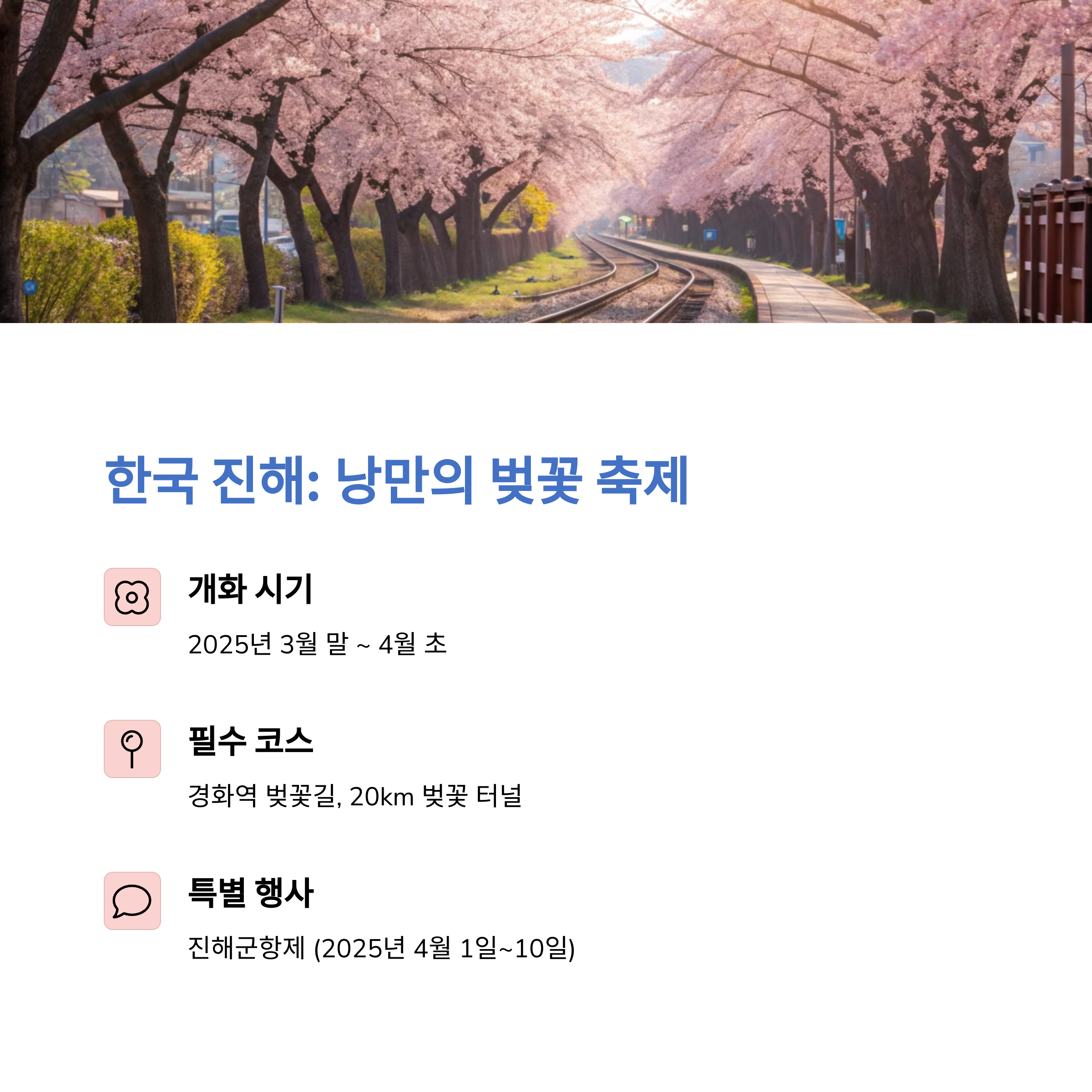 - 📷 명소: 여좌천 벚꽃 터널, 경화역 폐선길