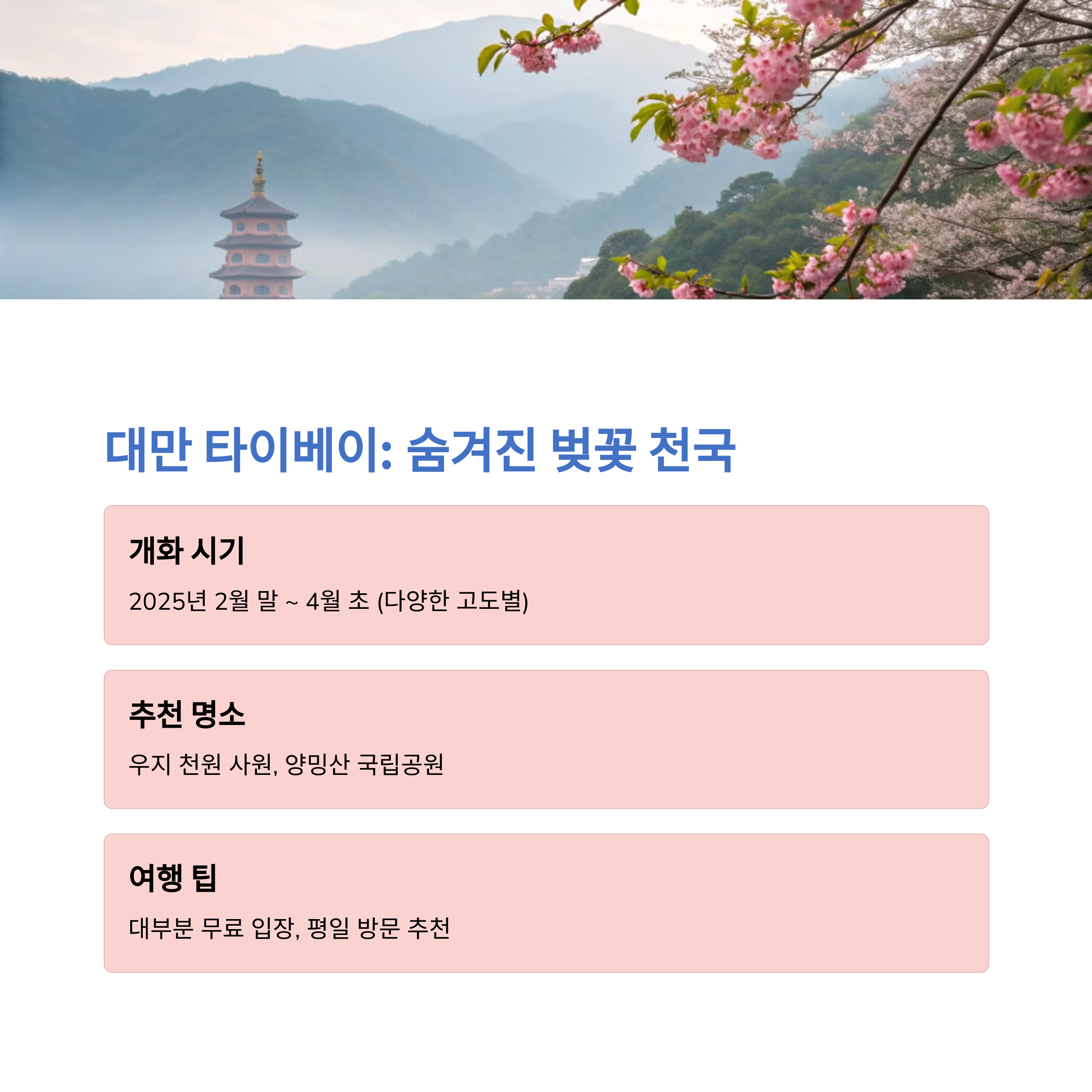 - 📷 명소: 자오핑공원 전망대, 온천 벚꽃 트레일