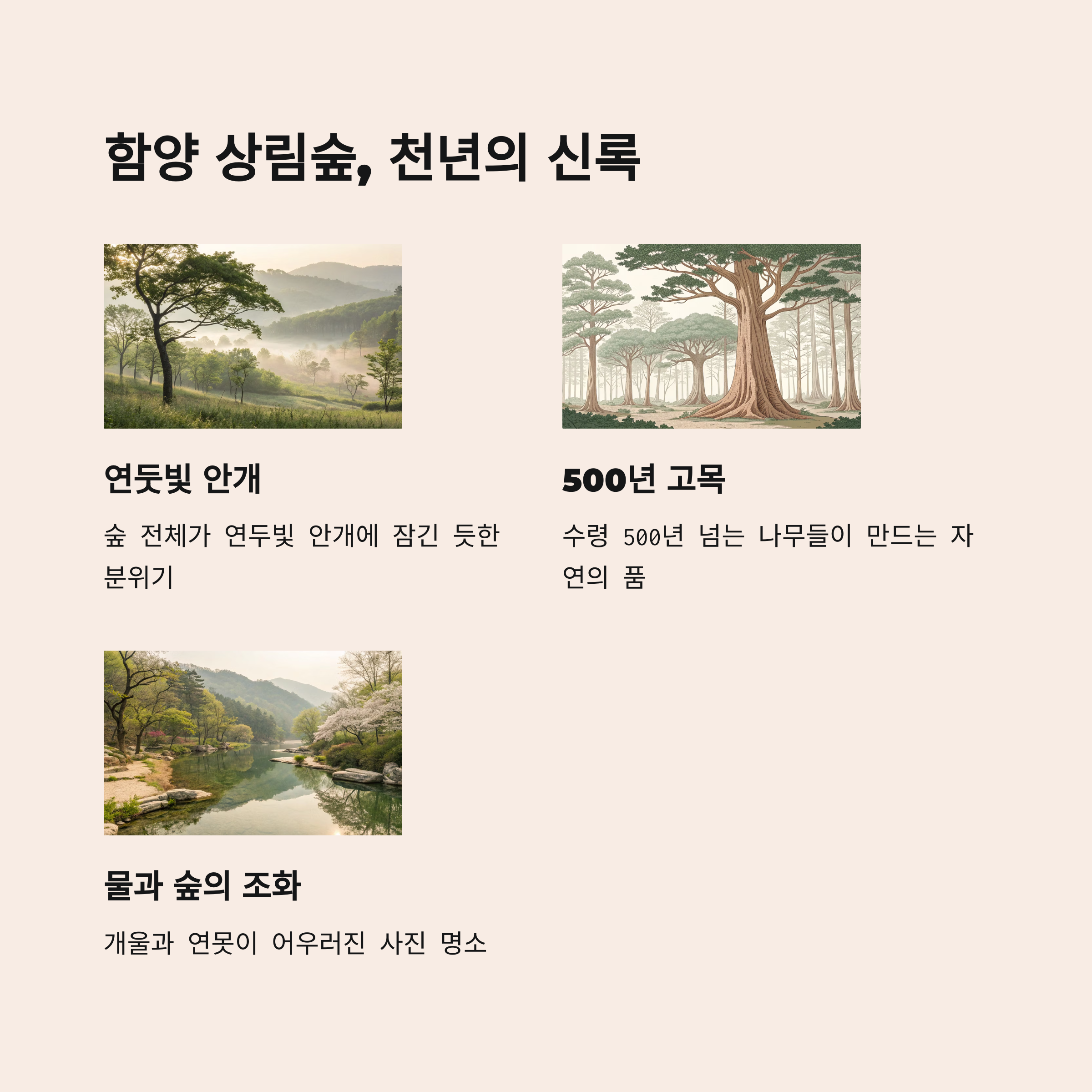 숲의 안정감과 설렘을 동시에 느낄 수 있는 장소입니다.