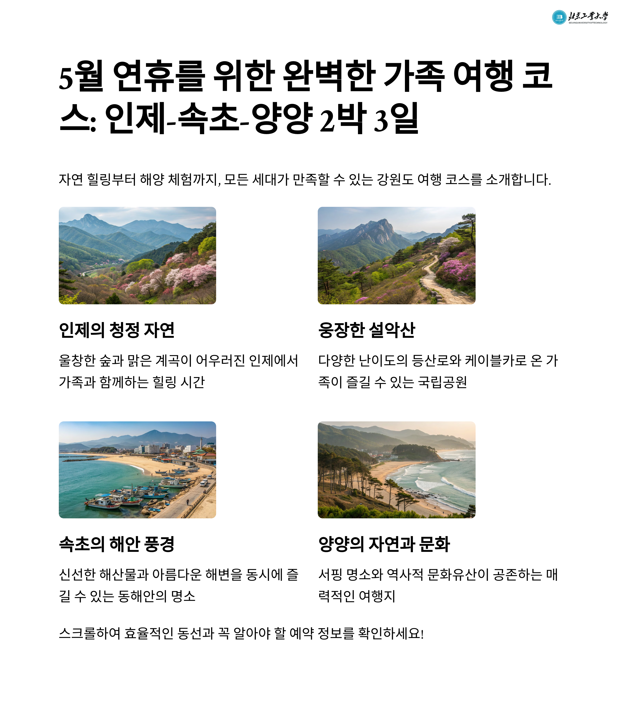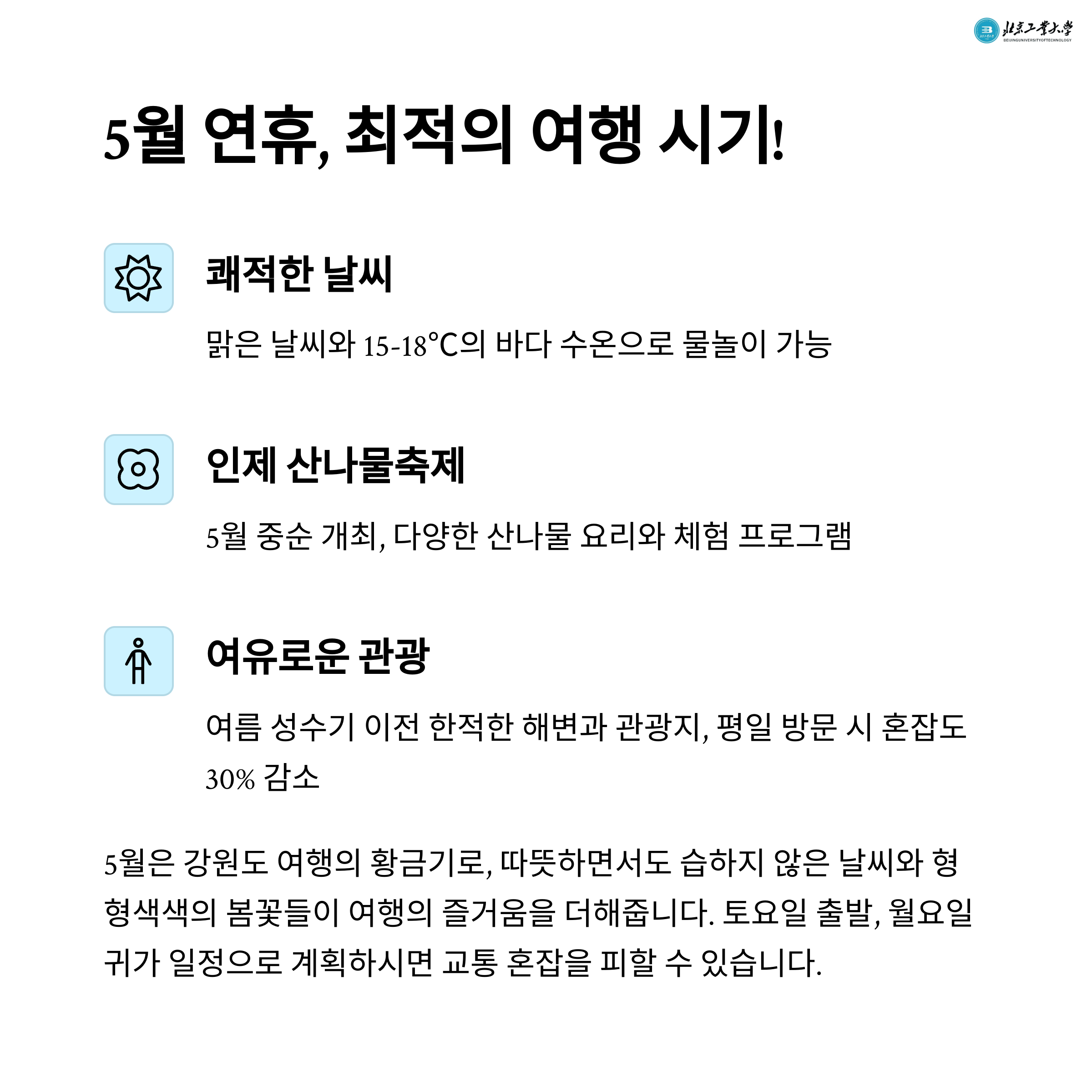 5월은 계절이 변하는 경계에 있는 시기입니다. 봄의 따스함과 초여름의 활기가 교차하는 이 시기, 길게 이어지는 연휴는 가족 단위 여행객들에게 최고의 타이밍입니다. 다양한 연령대가 함께 떠나는 가족 여행은 각자의 기대를 충족시켜야 하기에 일정 구성에 고민이 많죠. 이번 글에서는 실제로 경험한 2박 3일 강원도 여행 일정을 정보 중심으로 구성하여 공유합니다. 동선의 효율성, 체력 소모, 연령별 만족도를 모두 고려해 짠 일정이기에, 비슷한 상황의 독자 분들께 유용한 가이드가 될 수 있을 것입니다.