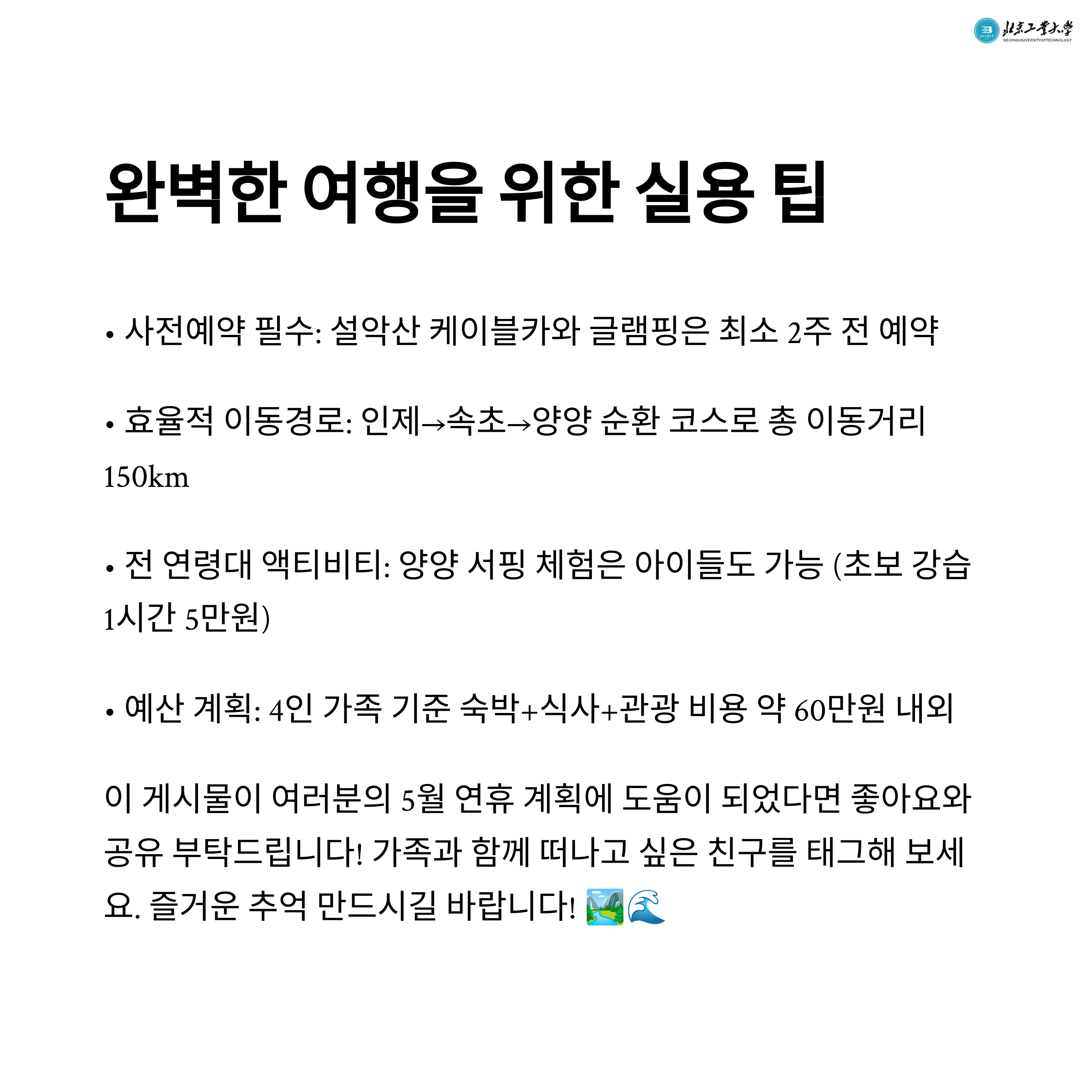 이번 2박 3일의 일정은 계절의 변화에 맞춘 체온 조절이 가능한 장소 선택, 연령대별 흥미 요소, 그리고 경제적인 예산 안배까지 골고루 고려된 여행이었습니다. 자작나무숲에서의 산책, 속초시장에서의 미각 여행, 바닷가에서의 레저 체험과 사찰의 고즈넉함까지… 이 모든 것이 하나의 여정 안에서 조화롭게 이어졌습니다.