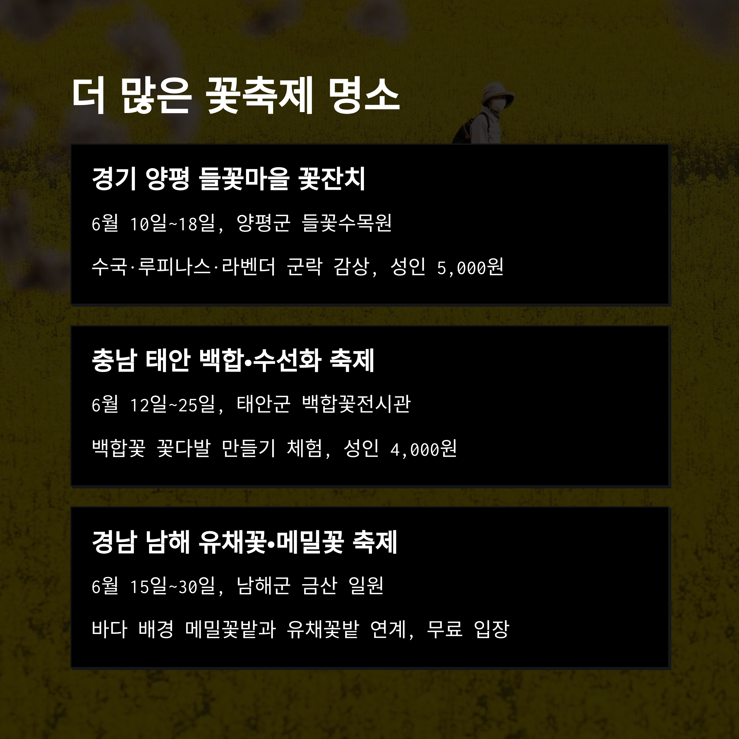 전국 각지의 주요 6월 꽃 축제 일정·입장료·교통·주차·맛집·사진 스팟까지 모조리 정리했습니다.