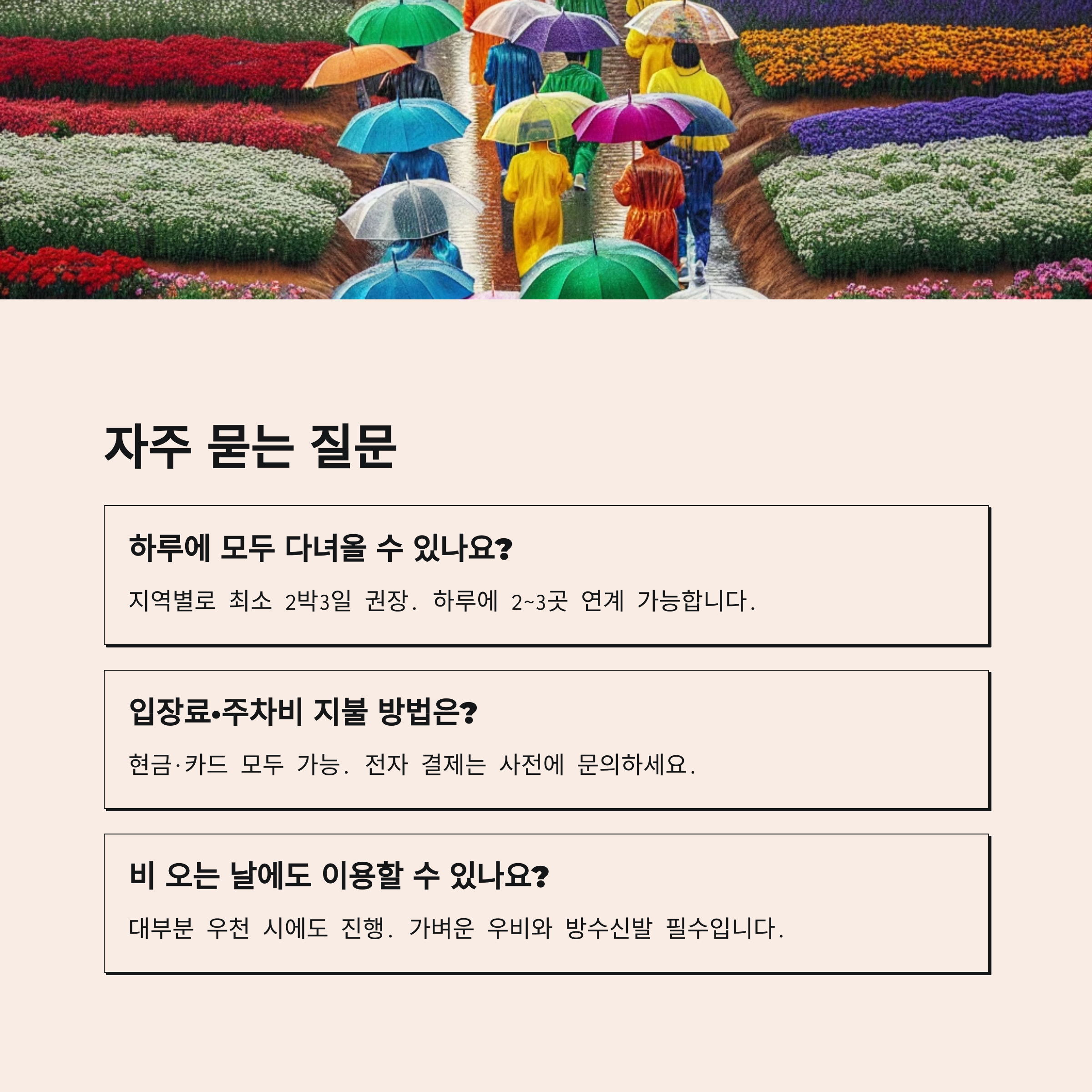 → 대부분 우천 시에도 진행. 가벼운 우비·방수신발 필수.