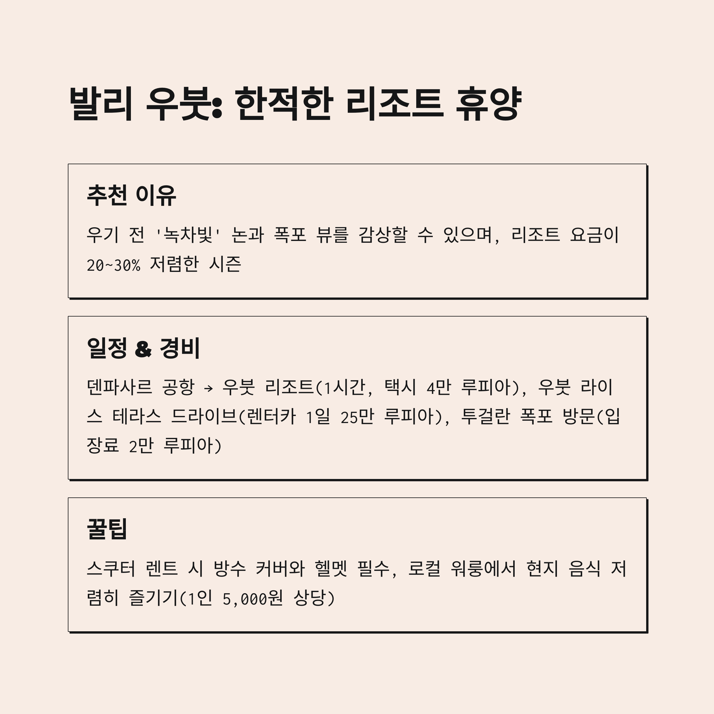 - 덴파사르 공항 → 우붓 리조트(1시간 소요, 택시 4만 루피아)