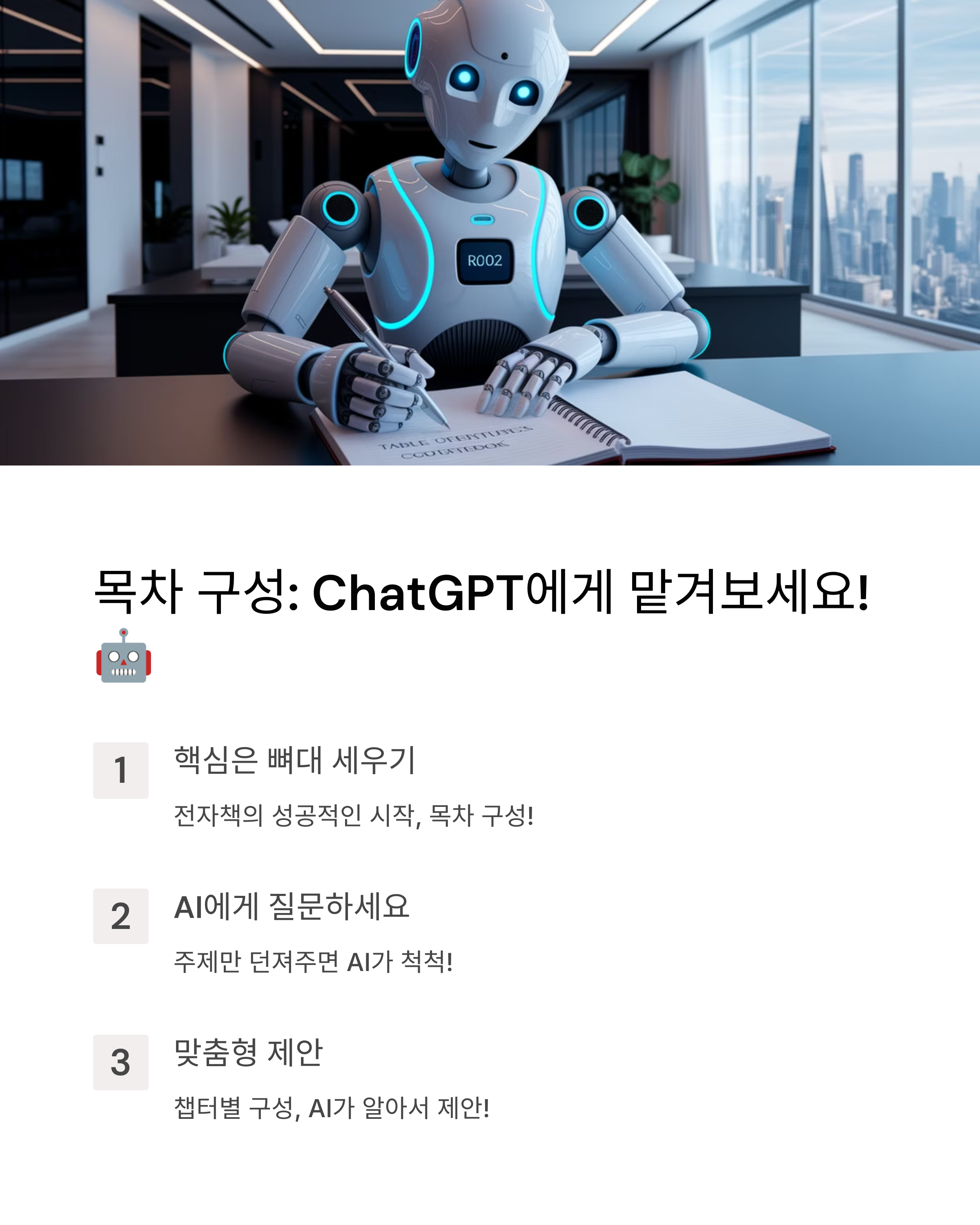 👉 "전자책 목차 추천해줘" 하면 AI가 쫘악 뽑아줌