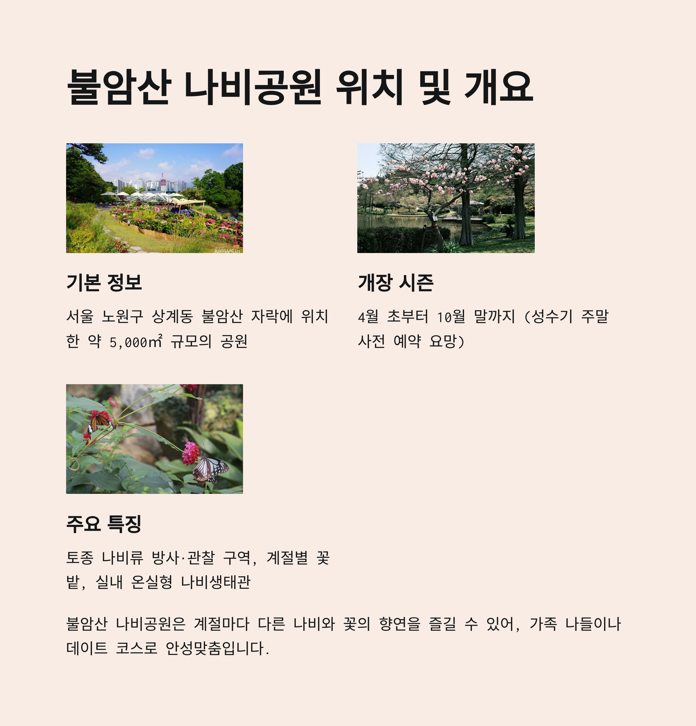 오늘은 불암산 나비공원의 위치·주차장·입장 방법·관람 포인트·주변 명소를 꼼꼼히 안내해 드렸습니다.