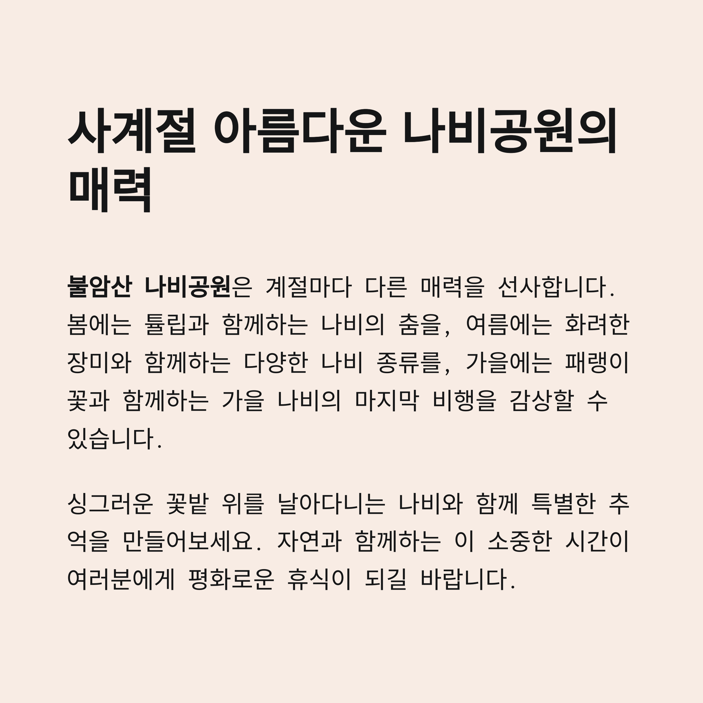 다음에는 여름철 계곡 명소, 가을 단풍길 코스로 돌아오겠습니다. 즐거운 나비공원 나들이 되세요!